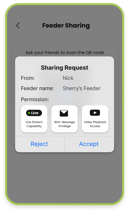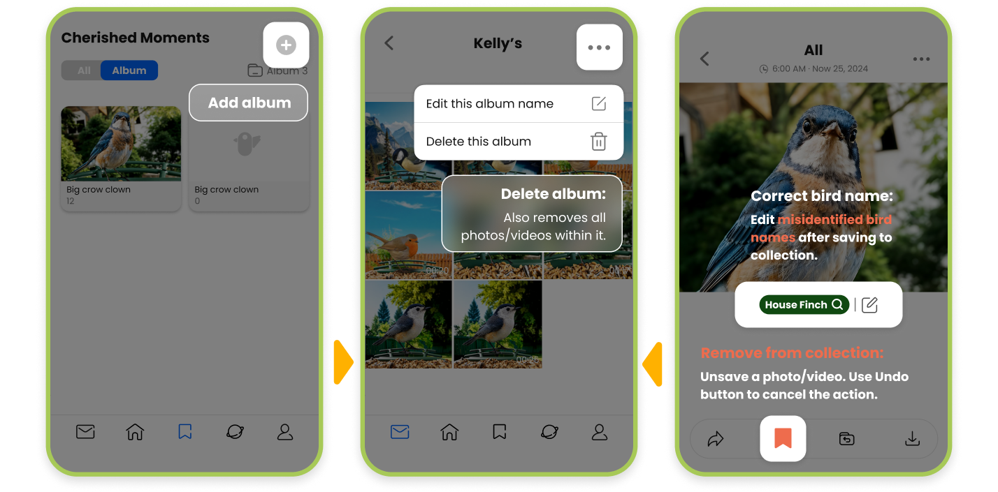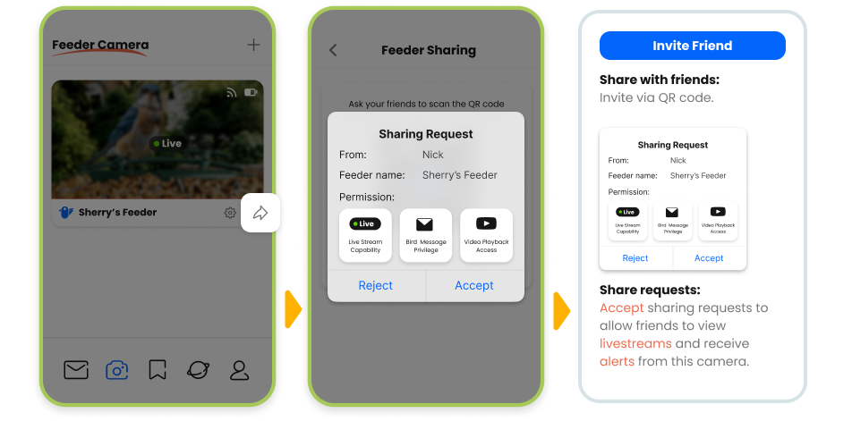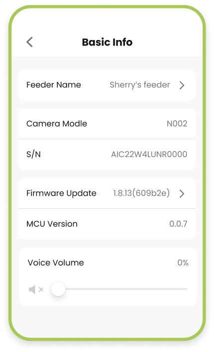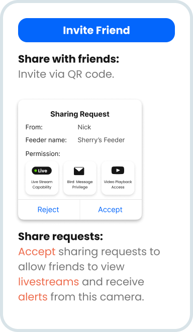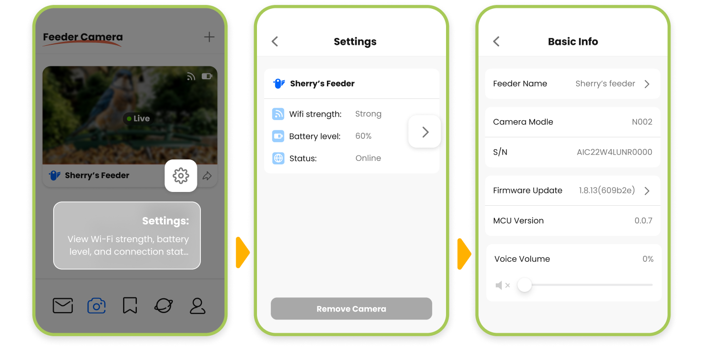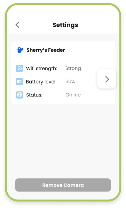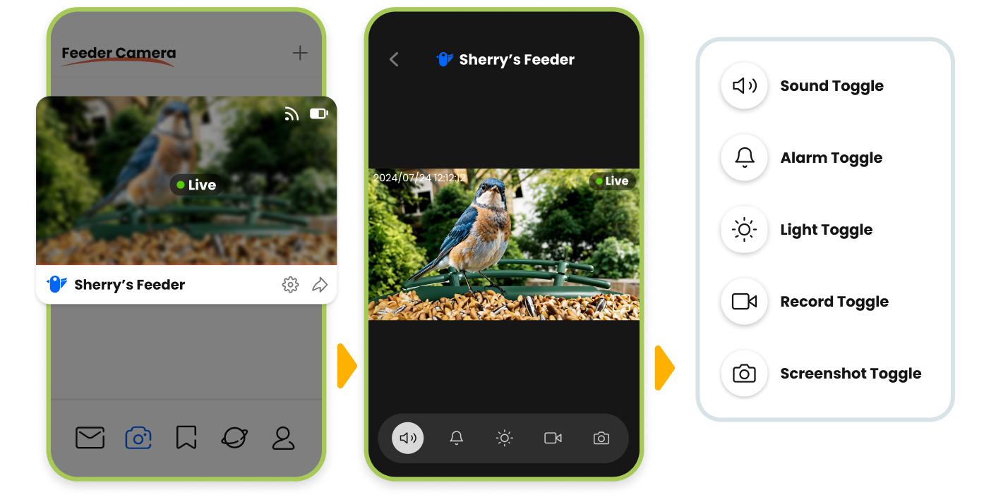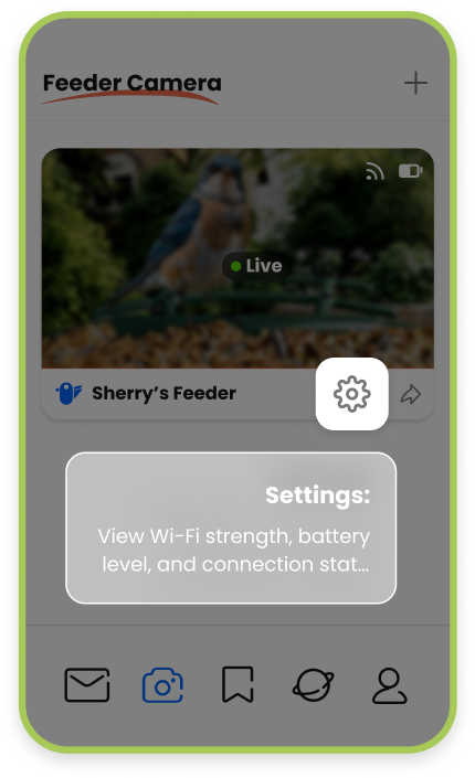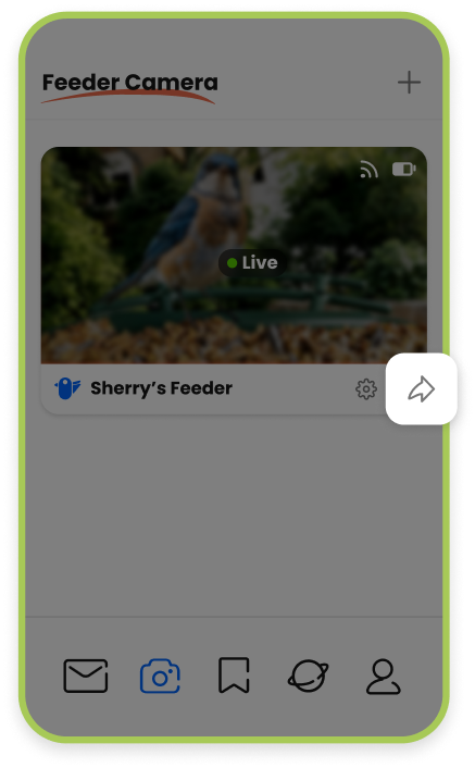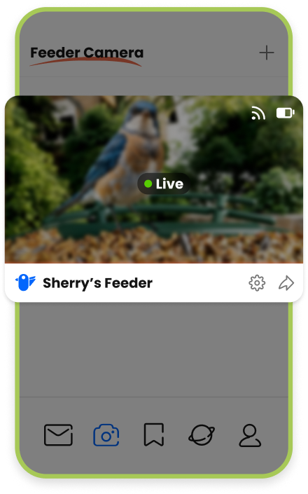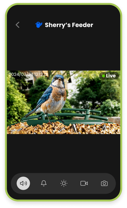 Once a camera is added, you can view its live stream and control features like sound, alarm, light, recording, and screenshot. Check status such as Wi-Fi strength, battery level, and connection status. You can also rename the device, update its firmware, or adjust camera volume. Share cameras with friends to allow them to watch livestreams and receive bird alerts.
