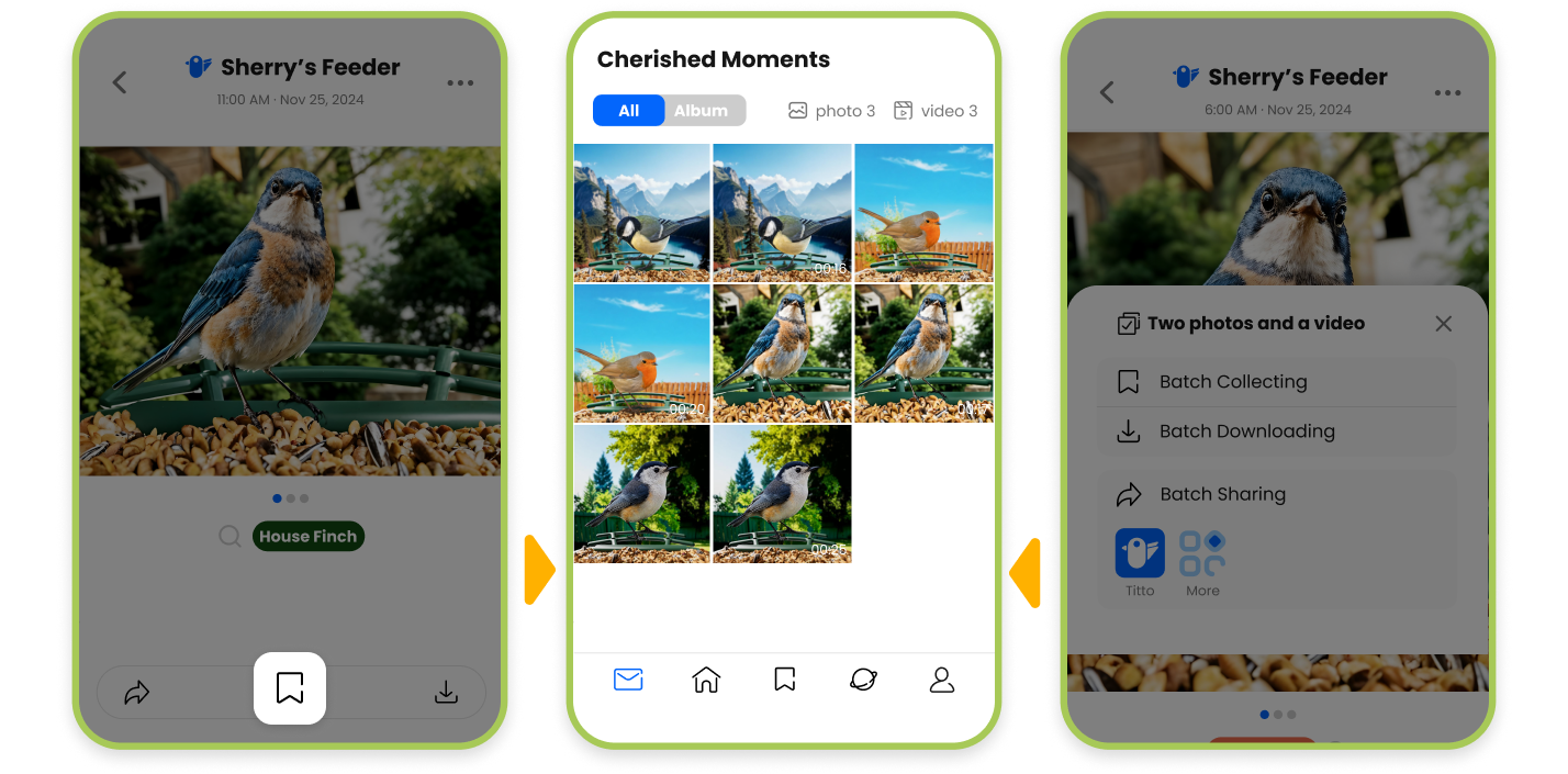 Alerts with 2 images and a 10s video are sent when a bird is detected (captures occur every 5 minutes to save battery). Tap any alert to view details. Messages are kept for 15 days.