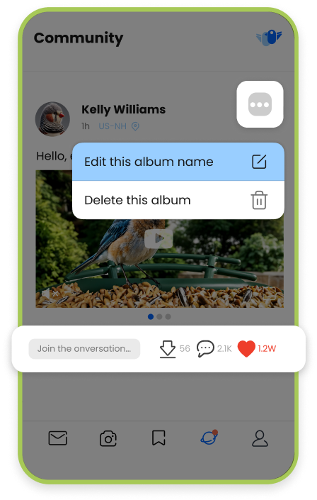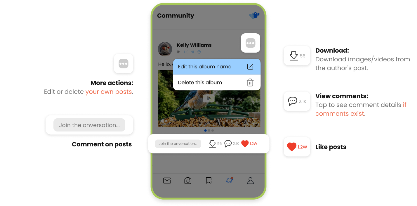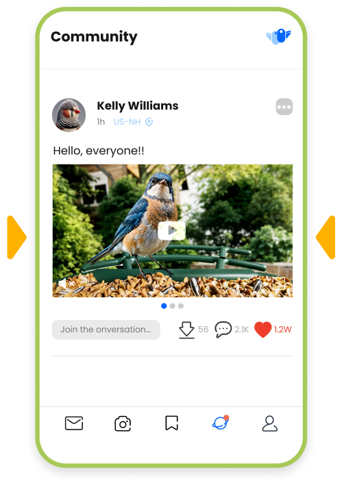 Learn anout device status (offline, low battery, bird alerts) and community interactions (likes, comments).